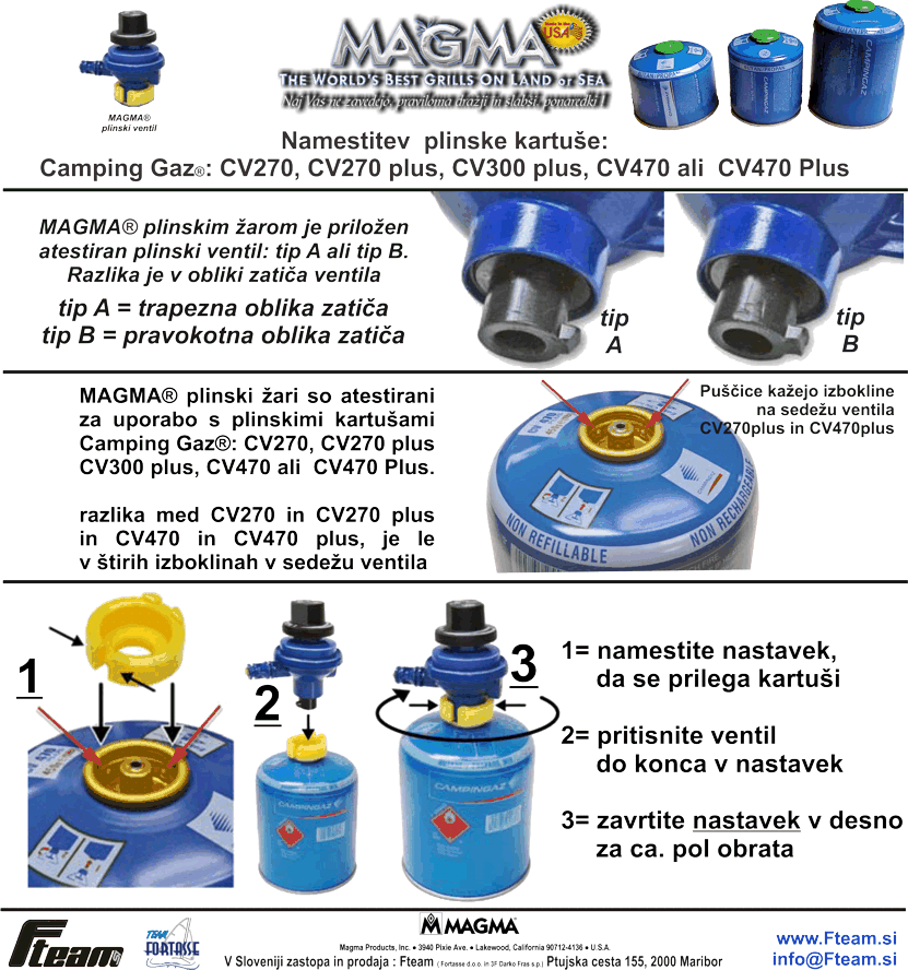 so ene pogosteje uporabljenih kartuš, kupiti jih je mogoče pri nas, v vseh prodajalnah s kamp opremo, na večini bencinskih črpalk in gradbenih centrih, v Merkur-ju, v trgovinah Jager, pa pri Intersportu, ... v slovenskem in hrvaškem primorju tudi v večjih samopostrežnih trgovinah, .... Poraba je odvisna od klimatskih razmer in od tega koliko boste odvili regulacijski ventil; za modele A10 bo CV270 ali CV300, zadoščala za 1-2 uri "grilanja", CV470 pa za 2 do 4 ure